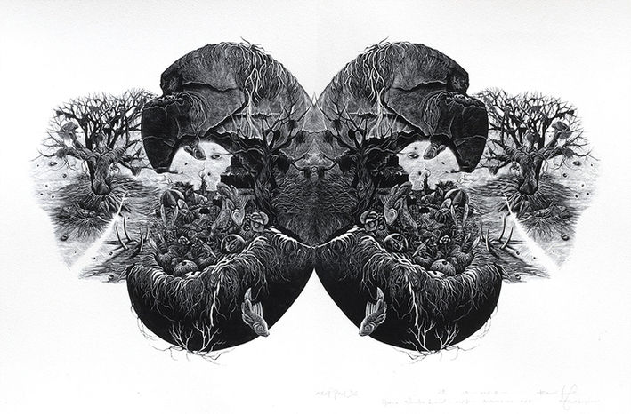 "Sunrises Again" Keisei Kobayashi: Wood Engraving 1981 - 2018 is the collection of prints created with one of the most difficult woodcut technique by Keisei Kobayashi. With the use of transversely cut wooden blocks which its solid feature helps in the making of very fine and detailed lines, this technique requires even more attention than woodcut technique whose blocks are usually lengthwise split wood. Artworks in this exhibition portray the harmonious coexistence of all creatures by placing forms of humans, birds, chickens, fish, etc. among the forest, sky, and imaginative paradise to present the idea of living together in a happy and equal environment.